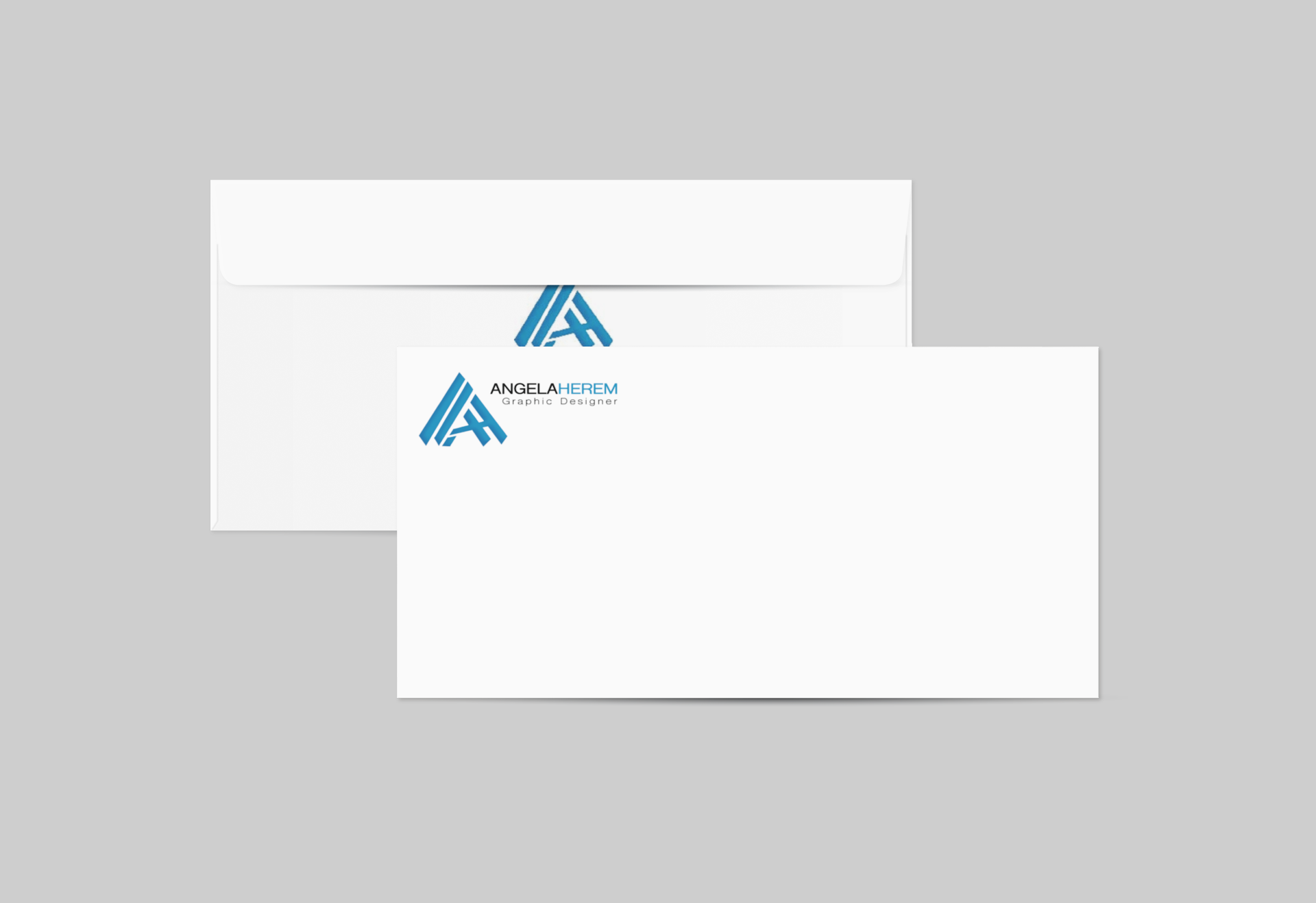 Angela Herem’s visual identity is strong, minimal, and professional, anchored by a stylized monogram and crisp typography.